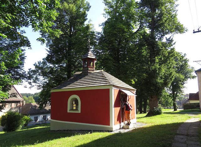 Ke kapli Andělů strážných byl jen malý kousek – známe tuto lokalitu, několikrát jsme tu byli, naposledy při akci ke Dni země, pořádané spolkem Příznivci přiměřeného pohybu z Větrného Jeníkova, při níž jsme z opačného směru prošli podstatnou část trasy, která byla teď před námi.