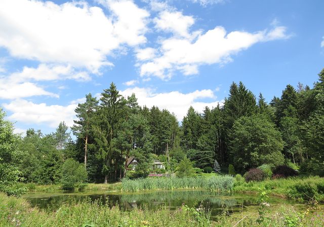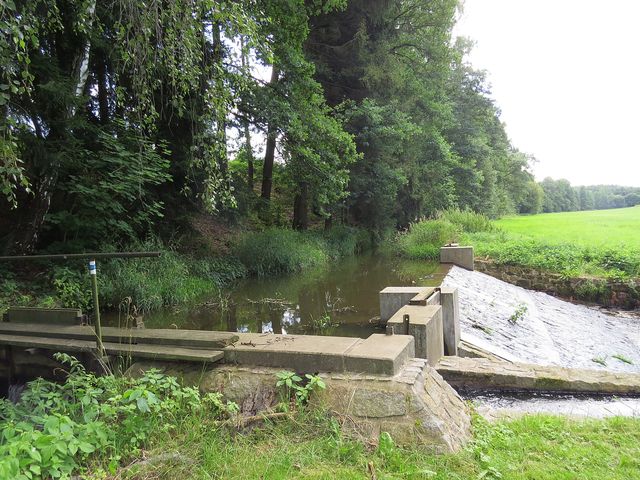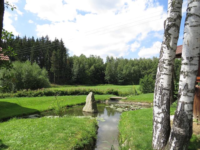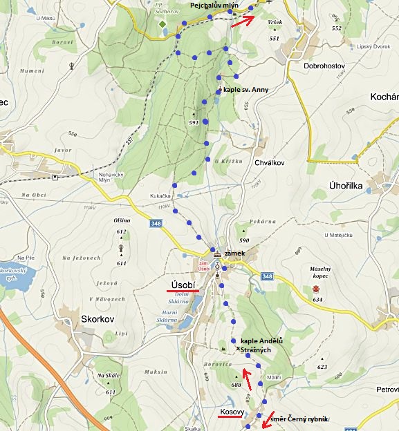 Značka pokračuje lukami podél Úsobského potoka, vlastně i v letošním suchém létě mokřinami, které poutníka dovedou k náhonu potoka, kde chybí jakýkoli přechod. Později jsme se dozvěděli, že tu bude vybudován můstek, a prý už snad je. My jsme každopádně využili všech svých schopností a turistických zkušeností, abychom se z tohoto zapeklitého úseku (nevíme, proč byl zvolen právě tento) způsobeného špatným, jednostranným značením, vymotali, což se nám nakonec podařilo nalezením brodu přes potok.
