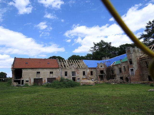 Neznačenou polní cestou jsme došli do nedalekých Kvasetic, které bohužel neleží na nově značené modré trase a nás zajímaly z výše uvedených důvodů – zdejší dvoukřídlý jednopatrový zámek s hranolovou věží jsme rozhodně chtěli vidět, zvláště, když jsme se dozvěděli, že má nového majitele, který se pustil do rekonstrukce.
