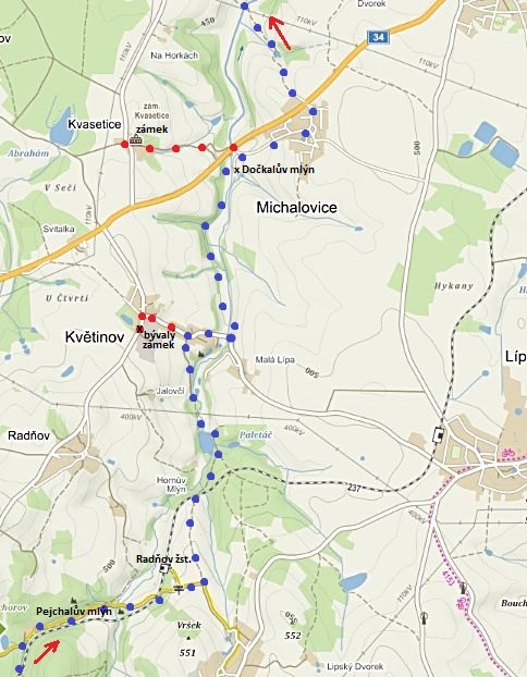 Před Pejchalovým mlýnem navazuje modrá značka na stávající žlutou, vede směrem k železniční zastávce Radňov, pak z ní odbočuje k rybníku Paletáč a dál vede do obce Květinov. Ani v mapách už není zaznamenán místní zámeček, přesto jsme se směrem do horní části obce, k silnici na Herálec, vydali, abychom si prohlédli, co z něj do dnešní doby zůstalo.