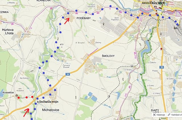 Za Michalovicemi, když trasa procházela méně přehledným terénem loukami a lesíky v údolí Úsobského potoka směrem k obci Poděbaby, bylo značení špatné – pravděpodobně pouze jednosměrné od Brodu – teď přišly na řadu zkušenosti nabyté turistikou. 🙂 Doufáme, že i tento úsek bude doznačen tak, aby ani ti, kteří oblast neznají, nebloudili – krajina je tu krásná a stojí za to poznat ji.