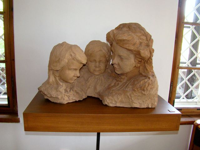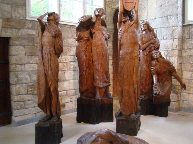 Pozoruhodná stavba má vyvolat dojem obilného pole – sloupy představují snopy zlatých klasů, neobvyklý obloukový půdorys vily připomíná stopu po sečení kosou… a ještě mnohá symbolika je zvenčí i v interiéru s původním vybavením zakomponována – celek tvoří ohromující umělecký soubor. Ve vile, kterou manželka Františka Bílka darovala v roce 1963 Galerii města Prahy, jsou prezentována Bílkova díla z jeho vrcholného tvůrčího období – v září 2010 byla po rekonstrukci otevřena nová expozice, příští rok v červenci jsme ji navštívili – zařadím pouze jednu fotografii sousoší z cyklu Budoucí dobyvatelé:
