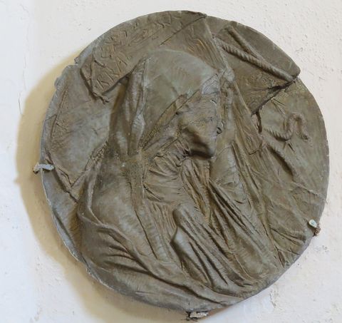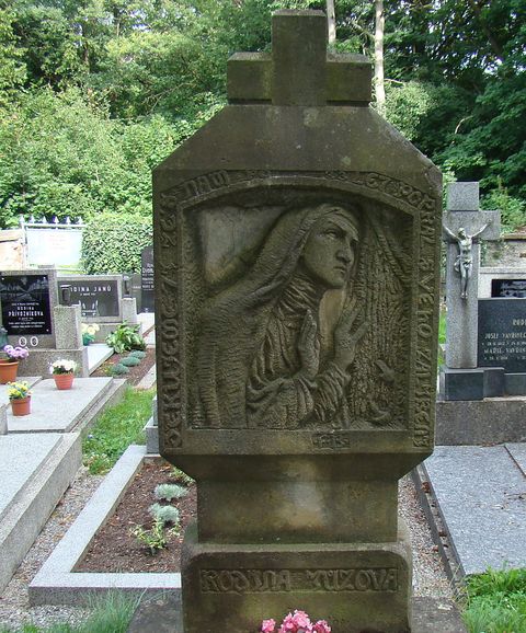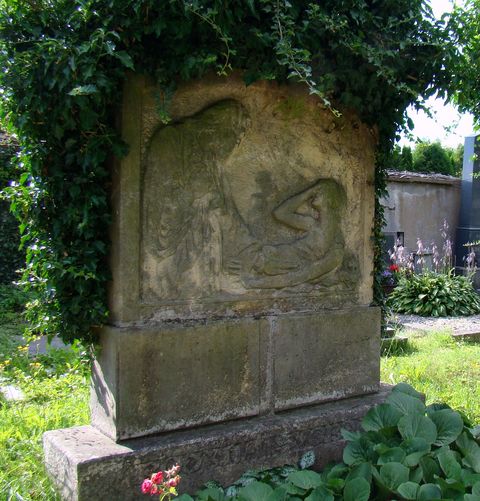 Námětem kruhového reliéfu na náhrobku Marie Novákové je Ježíšovo podobenství o pěti pošetilých a pěti rozumných pannách.