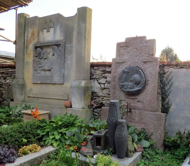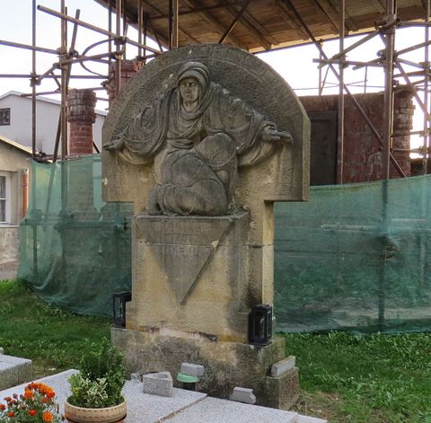 Pro základ uvedených textů jsem kvůli špatné luštitelnosti na kamenných náhrobcích použila informace z tabule na hřbitově, bohužel také obtížně čitelné – myslím ale, že sochařská díla tvoří s texty jednotu.