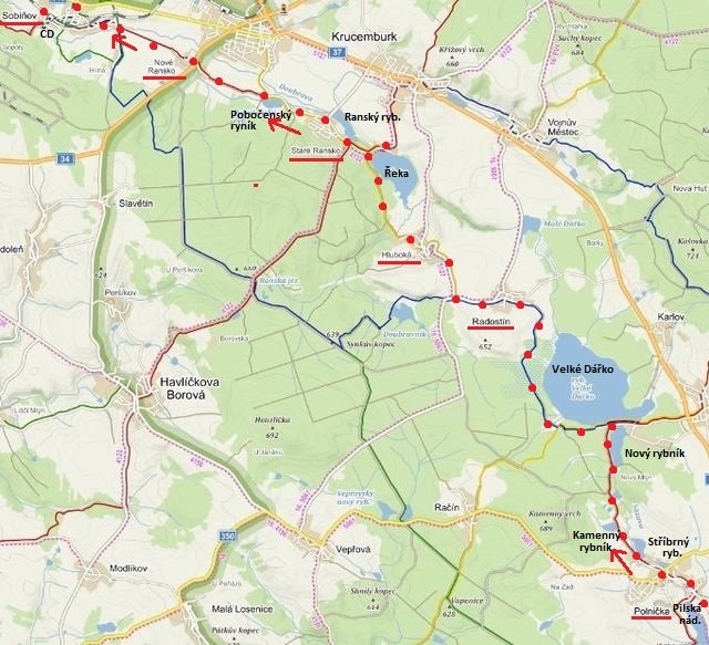 Polnička ČTZ – Kamenný rybník – Nový rybník – Velké Dářko MTZ – Radostín – u rozcestí Pod kopcem ŽTZ – Hluboká – rybník Řeka (hráz) – Staré Ransko – Pobočenský rybník ČTZ – Nové Ransko – Sobíňov, rozcestí Na hrázi – tvrz Soběnov – hostinec U Štefana = 20 km