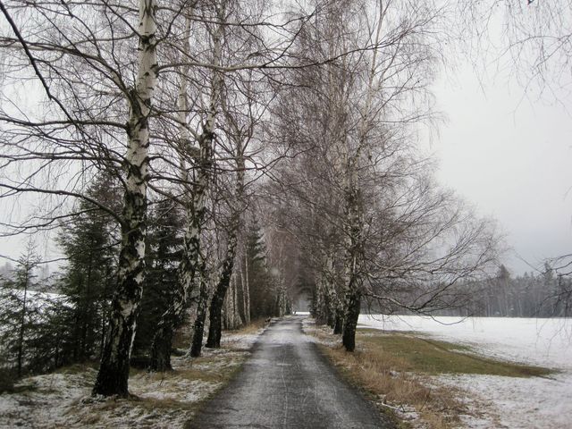 Na rozcestí u Dářka (610 m n.m.) jsme se vydali rašeliništi a slatinnými loukami po modře značené trase směrem k Radostínu, před nímž je překrásná březová alej.
