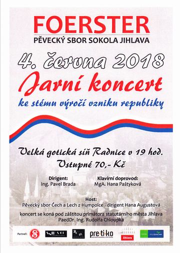 Sluší se uvést také koncert, který se konal v pondělí 4. června 2018 v gotickém sále jihlavské radnice – Pěvecké sbory Foerster Sokola Jihlava se sbormistrem Pavlem Bradou a Čech a Lech z Humpolce se sbormistryní Hanou Augustovou oslavily svým zpěvem vznik Československé republiky před 100 lety. Z následujícího programu je jasné, že žádný z návštěvníků koncertu nemohl zůstat nezúčastněný, všichni jsme souzněli… 🙂