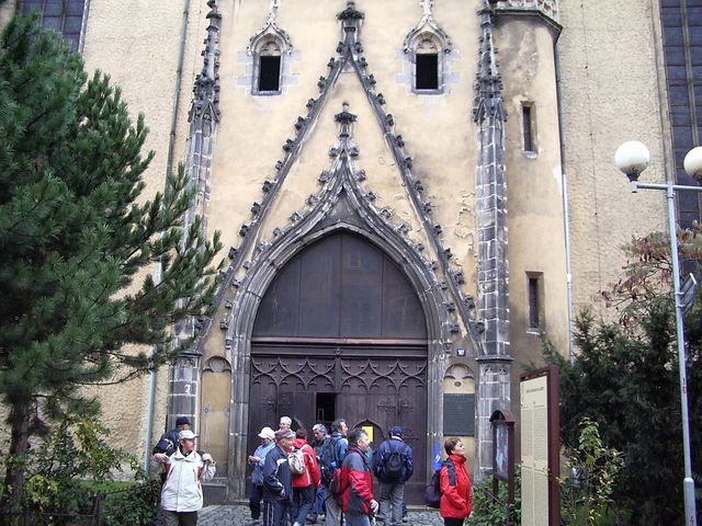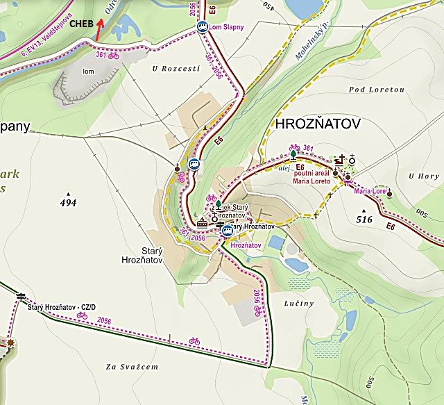 Procházka Sokolovem ukončila turistické putování, následující hodiny patřily návštěvnickému poznávání Chebu a nejbližšího okolí. Poutní areál Maria Loreto ve Starém Hrozňatově nás lákal nejen tím, že velkolepá barokní stavba vstala v posledních letech až zázračně z trosek – k uzavření historie kláštera Teplá, resp. jejího zakladatele blahoslaveného Hroznaty, jsme chtěli popatřiti na zámek Kinsberg (Kynšperk či nejnověji Starý Hrozňatov), v jehož věži prý tento šlechtic rodem i duchem právě před 801. rokem skonal mučednickou smrtí.