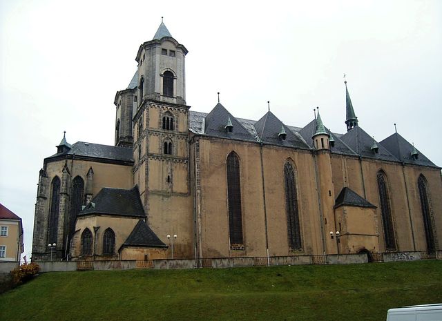 chrám sv. Mikuláše a sv. Alžběty v Chebu – foto z roku 2006, kdy na věžích ještě trůnily provizorní helmiceturisté před vchodem do kostela – 17. 11. 2006