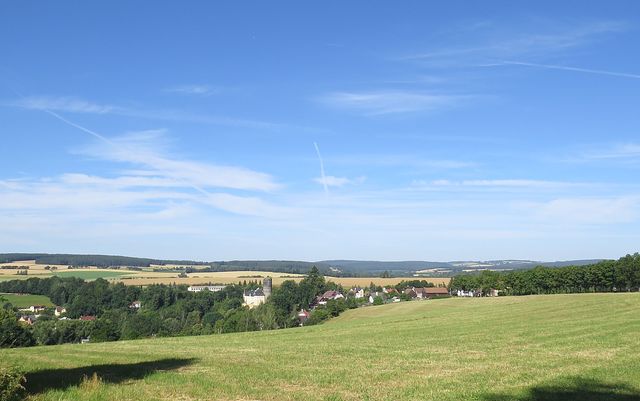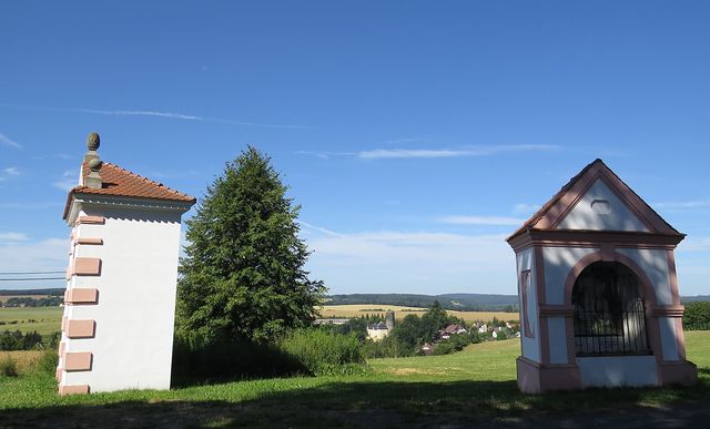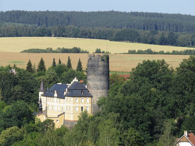 obec Starý Hrozňatov a poutní areál Maria Loreto v Hrozňatově 8. 7. 2018pohled od poutního areálu Maria Loreto na Starý Hrozňatov s hradem a zámkem – objekt je od roku 2006 v soukromém drženípůvodní románský hrad Kinsberg byl založen před rokem 1200 na ostrožně nad Mohelenským potokem ve vsi Alt Kinsberg (Starý Hrozňatov), první zmínka je z roku 1217 v souvislosti s mučednickou smrtí blahoslaveného Hroznaty, zakladatele kláštera Teplá, který podle legendy zemřel 14. 7. 1217 v Černé věži zdejšího hradu