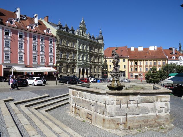 Vrátili jsme se na náměstí a v jeho hořejší části nás zaujal vysoký kovový sloup s patinou rzi, od něhož se po dlažbě pěší zóny táhla několik stovek metrů dlouhá kovová léga s perforováním – její hlavní činnost sice spočívala v odvádění povrchové vody, ale na každém, asi 50 cm dlouhém díle byla zaznamenána událost ze života města Chebu. Vedle letopočtu stručný text, pod ním i německý a anglický. Úžasný nápad! S očima přilepenýma k dlažbě jsme krok-sun-krok objevovali slavnou minulost města a v duchu obdivovali autora tohoto projektu!