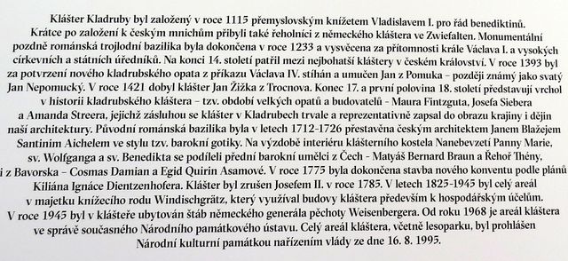rozcestník u kláštera v Kladrubechhlavní vchod do klášterního areálu Kladrubyhistorie benediktinského kláštera Kladrubycelkový pohled na opatský chrám, dominantu areálu i okolní krajiny; foto z propagačního letákuhlavní průčelí Nového konventu postaveného podle projektu Kiliána Ignáce Dienzenhoferana pravé straně nádvoří je stará prelaturachrám Nanebevzetí Panny Marie, sv. Wolfganga a sv. Benedikta v klášteře Kladruby – pohled od severuchrám přestavěl na začátku 18. století slavný architekt Santini ve stylu české barokní gotikyvýhled z klášterního vrchu nad řekou Úhlavkou na městečko Kladruby u Stříbra (má asi 1 500 obyvatel)západní průčelí kladrubského chrámu Nanebevzetí Panny Marie – konají se v něm i koncerty klasické hudbyvýzdoba západního průčelí chrámu v klášteře Kladrubyinteriér opatského chrámu kláštera Kladruby – foto z informační tabulezápadní průčelí klášterního chrámu v Kladrubech a zadní strana budovy starého konventu; www.svatosi.cz