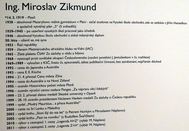 Ke 100. výročí narození legendárního cestovatele Miroslava Zikmunda (*14. 2. 1919) byla v 1. podlaží budovy 14 uspořádaná výstava uměleckých děl – plastik, obrazů a soch – inspirovaných jeho životem a dílem. K vidění byla i spousta panelů a filmového materiálu – zařadím jen několik fotografií, na nichž si mohou zájemci zopakovat nejdůležitější životní momenty obou slavných cestovatelů H+Z.