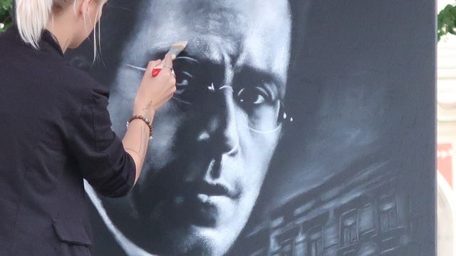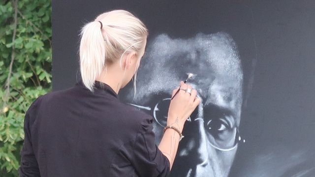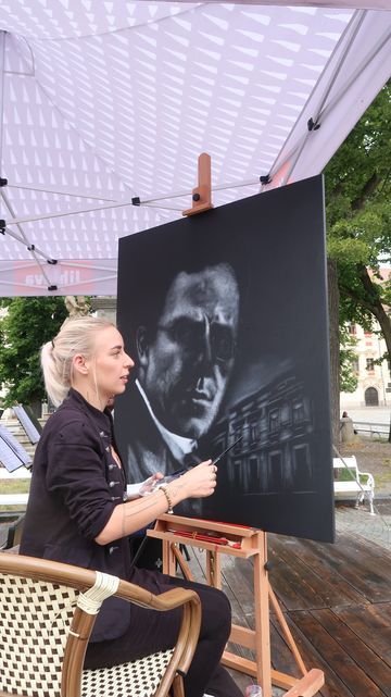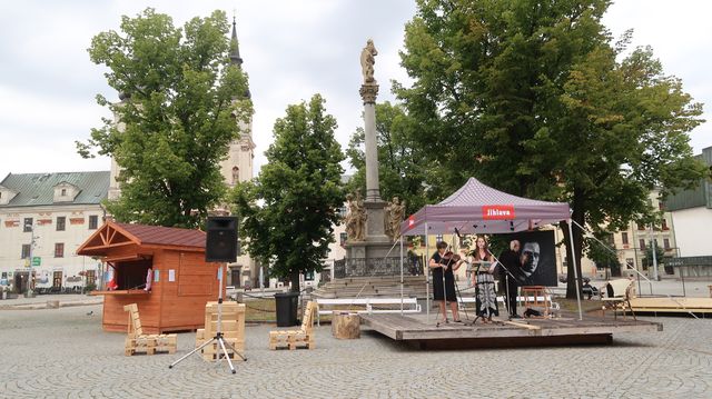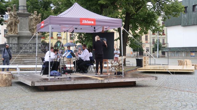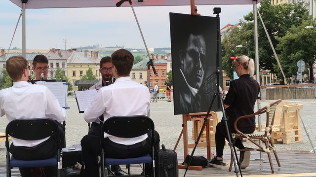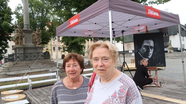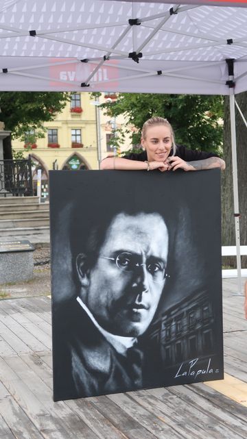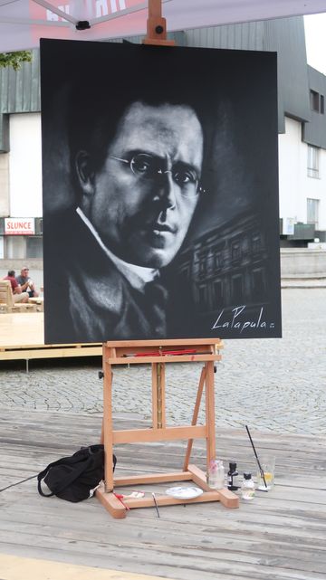 S Martou a Silvou jsme se vypravily na první akci, v níž bylo avizován vznik velké podobizny Gustava Mahlera na náměstí, a v těch asi dvou hodinách, po které bude jihlavská výtvarnice La Papula portrét tvořit, mohou si návštěvníci také poslechnout hudbu. Problémem bylo nestabilní počasí, opravdu i během doby, kdy akce probíhala, dost silně zapršelo, ale umění výtvarnice a příjemná hudba asi stovku návštěvníků udržely na místech.