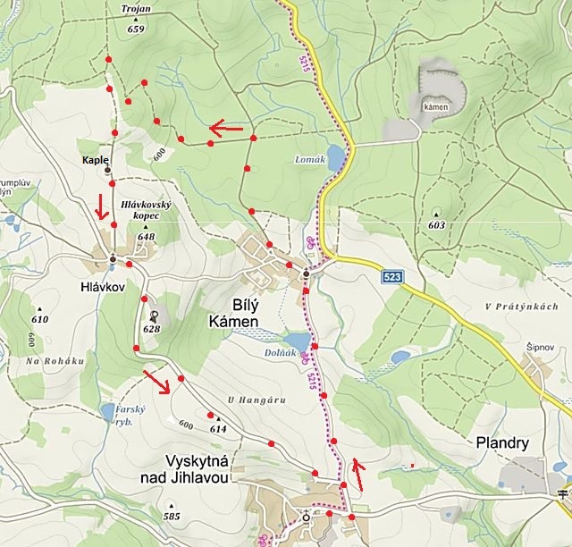 V poslední části trasy bylo nutné vystoupat do kopce k Vyskytné a stihnout autobus, který mě, dávnou a dosud žasnoucí spolužačku, dopravil do Jihlavy.