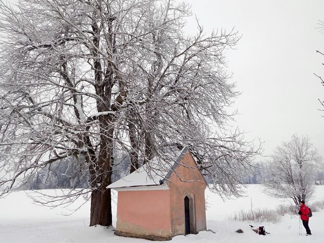 Příštích několik kilometrů bylo téma rozhovoru jasné. Vyšly jsme z lesa na cestu mezi poli a loukami a spanilý rozhled, který se otevřel, nás přinutil soustředit k němu pozornost. Pod ochranou dvou mohutných lip zářila růžovými stěnami kaplička – sen uprostřed volné přírody, nebeský klid a my!