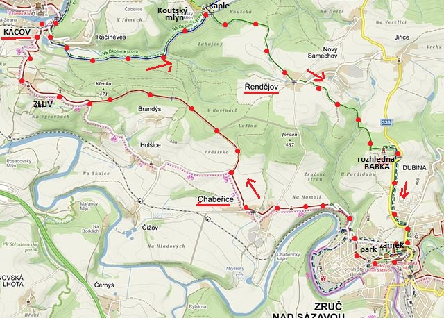 Ze Zruče nad Sázavou po ČTZ do Chabeřic, Zliva a Kácova, pak po MTZ do Račíněvsi a ke Koutskému mlýnu, odtud po ZTZ do Řendějova, po výstupu na rozhlednu Babka návrat do Zruče nad Sázavou = 20 km