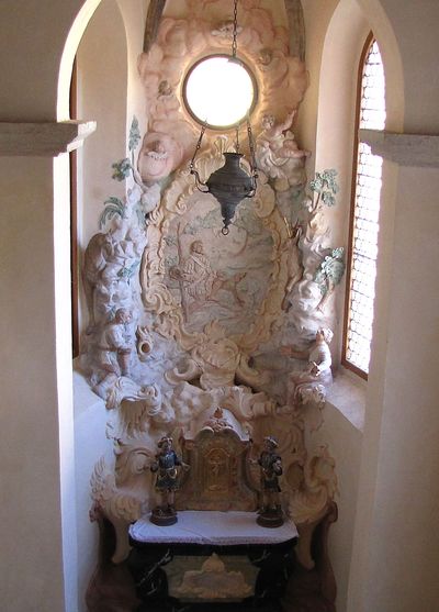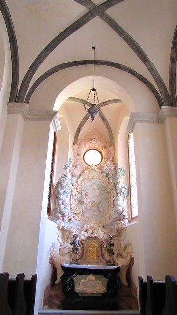 Průvodce nás upozornil na novou podlahu z mrákotínské žuly – jeden ze čtrnácti čtverců dlažby se barevně odlišuje – to proto, že sv. Eustach patří ke 14ti svatým pomocníkům v nouzi.