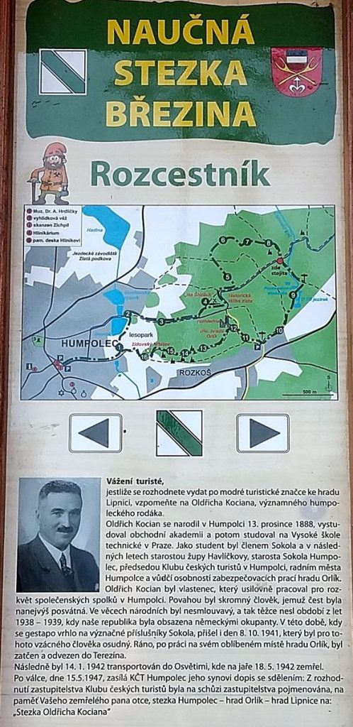 Naučná stezka Březina byla pojmenovaná po známém humpoleckém pedagogovi Otakaru Březinovi, má 16 zastavení, kde se turista dozví o historii města a o středověké těžbě zlata a kamene, je dlouhá 7 km. My jsme do příchodu na hrad Orlík, kde jsme byli odměněni pamětním listem a špekáčkem inzerovaným v názvu pochodu, prošli zatím jen její část.