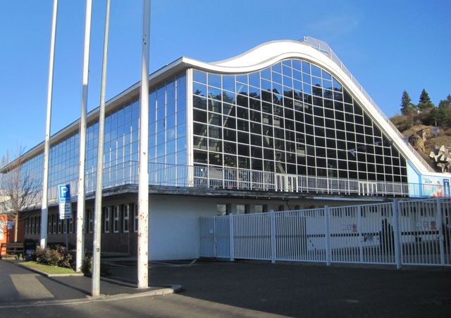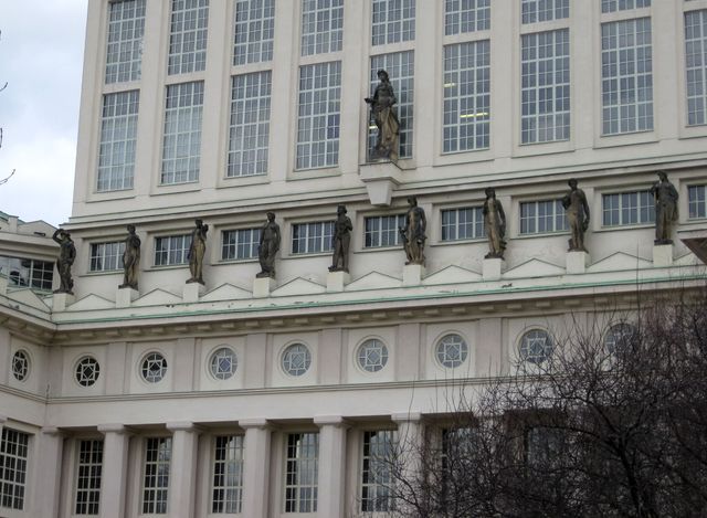Nežli se vydáme parkem a sportovišti k sokolovně, pokocháme se znovu impozantním jižním průčelím Podolské vodárny: