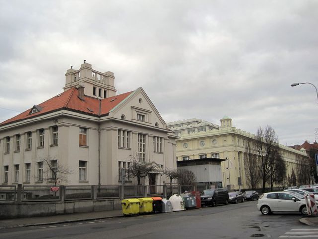 Na protější straně zadního traktu vodárny je Nedvědovo náměstí – ústředním bodem je impozantní školní budova.