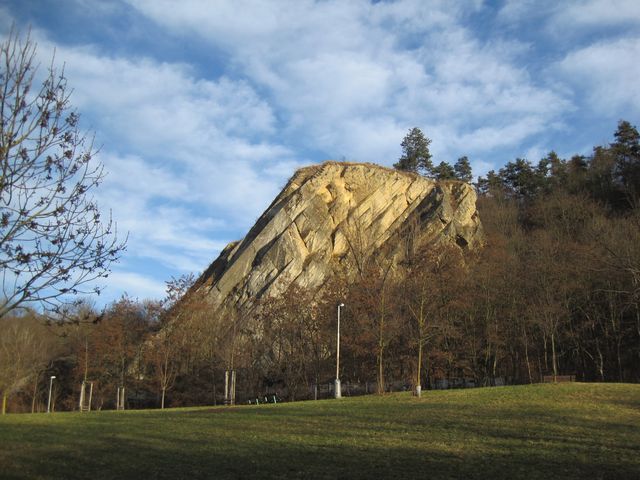 Popis trasy nás neomylně přivedl do parku ke sluncem nasvícenému skalnímu masivu.