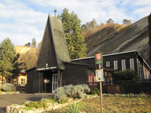 Parkem pod Branickou skálou jsme došli k místu, kde nelze přehlédnout zvláštní dřevěný evangelický kostel – byl otevřen, tak jsme mohli vstoupit a prohlédnout si interiér, hodně odlišný od katolických kostelů.