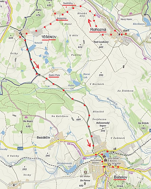 Těšenovem prochází modrá turistická značka z Nového Rychnova do Dolní Cerekve – té jsme se drželi až do osady Zadní Pole, které už je místní částí Batelova, kam jsme došli po zeleně značené trase.