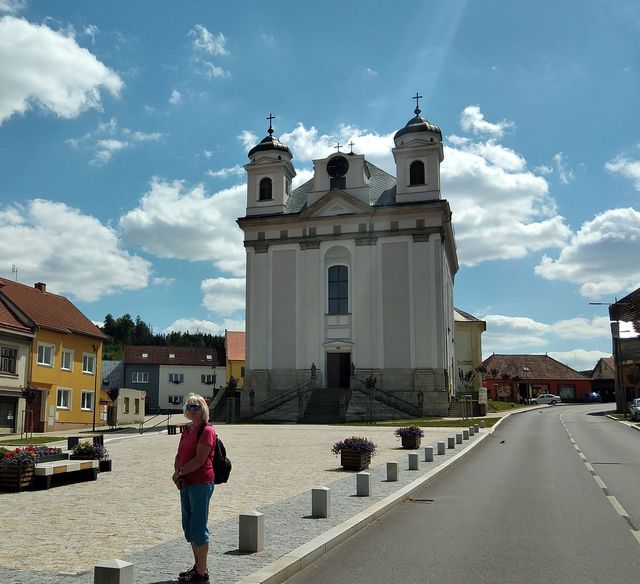 Batelovské náměstí prošlo před nedávnem důkladnými úpravami a je opravdu velice hezké! Na prohlídku jsme měli dostatek času a krásné počasí bylo spojencem. Nejdříve Iva naši skupinu vyfotografovala nedaleko Nového zámku.