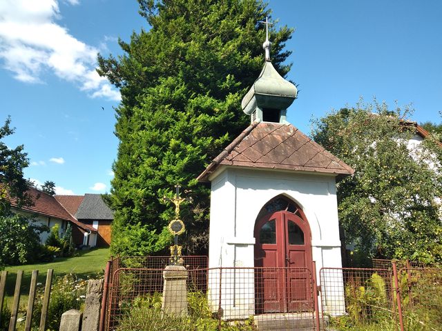 Pokračovali jsme krásnou polní cestou mezi loukami – daleké výhledy (např. na Javořici) pod přívětivou oblohou nevybízely ke spěchu – a pak se ocitli v osadě Kopaniny. Kaplička na návsi a vše upravené a tiché jako v pohádce.