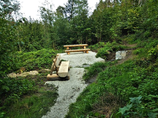 Tak vyhlížela studánka po dokončených úpravách.Ve spolupráci s Lesy ČR vznikl odpočinkový prostor kolem pramene.