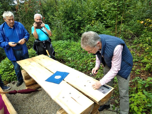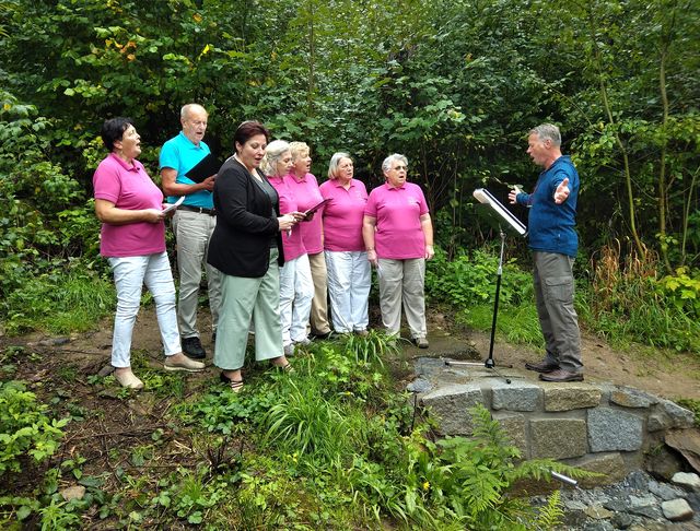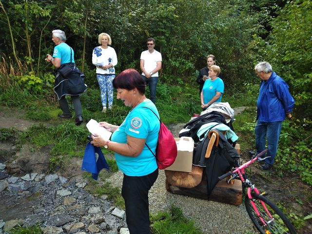 Miloš Vystrčil prohlíží výsledné dílo blízko břehu řeky Jihlavy. Foto Iva.Zahajovací řeč Miloše Vystrčila vyslechli kromě turistů i členové pěveckého sboru Förster Sokola Jihlava se sbormistrem Ing. Pavlem Bradou. Foto asistent senátora.Předsedkyně odboru KČT Tesla Jihlava Ing. Míla Bradová poděkovala všem za spolupráci a popřála studánce snadný život a čistou vodu. Foto Iva.Pěvecký sbor podpořil svým výkonem slavnostnost chvíle. Foto Iva.Tabulka s informacemi pro návštěvníky místa. Foto Iva.Označení zhotovitele a patronů studánky připevnil Miloš Vystrčil. Foto Iva.Na tabulkách je tento text. Foto Jiří Veselý.Společnou fotografii turistů a členů pěveckého sboru s předsedou Senátu PČR Milošem Vystrčilem udělal jeho asistent.