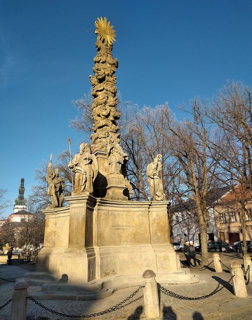 Centrem sousoší je Panna Marie s Ježíškem, nad ní je umístěna holubice Ducha svatého, obklopená svatozáří. Sloup bývá často chybně označován za „morový“, ale jako důstojnou ozdobu náměstí jej tehdy objednala městská rada a děkanství.