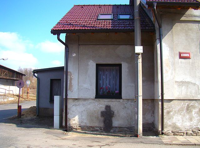 Poté stoupání silničkou na náhorní plošinu, jejíž možnosti byly využity pro stavbu dvou větrných elektráren, stále dál do obce Dolní Jablonná (asi 100 obyvatel), kam jsme vešli kolem kravína, u něhož fungoval mlékomat s v okolí se pohybovalo několik koček. 🙂