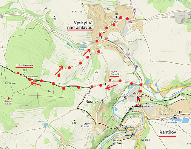 Z Rantířova na Horu sv. Antonína ke kapličce, poté sestup a odbočení vlevo do Vyskytné nad Jihlavou k autobusu.