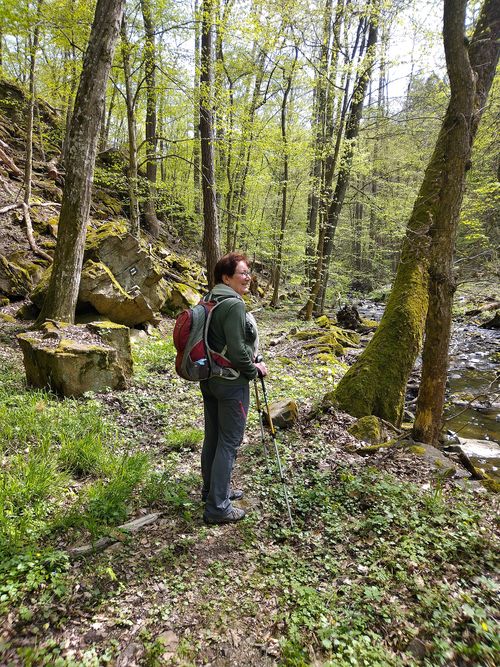 Vycházka kolem Nedveky byla odměnová – pochvalovaly jsme si s Ivou možnost projít tak nádherný kus přírody prosvětlený žlutozelenými rašícími listy stromů a překračovat rozkvetlé petrklíče, sasanky, podléšky a plicníky.