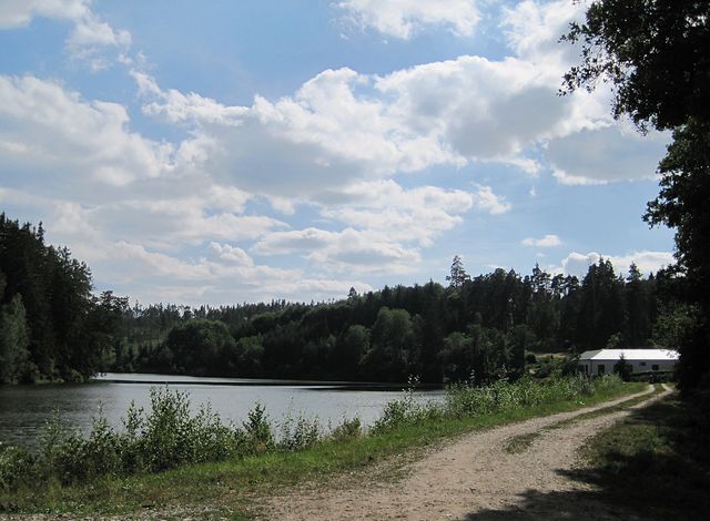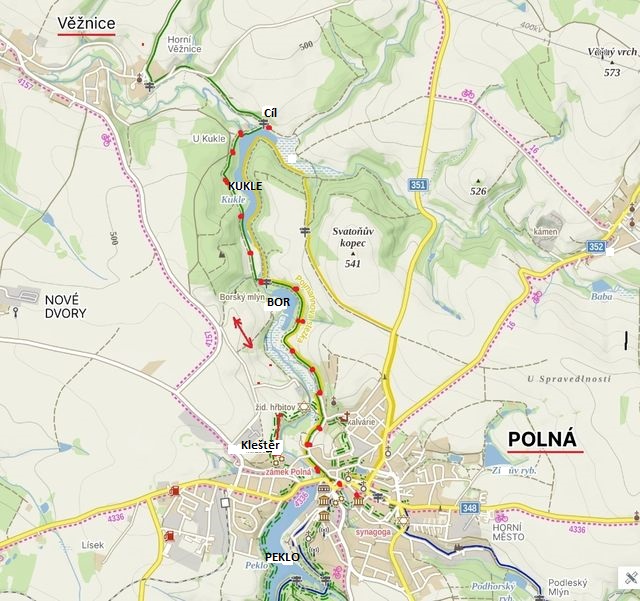 U Borského mlýna (2 km od Polné) jsme přešli na zelenou turistickou značku, která pokračuje po druhém břehu rybníka Kukle nežli žlutá. Šli jsme směrem ke hrázi a vesnici Věžnice, což byly asi 2 km. Cesta kolem rybníka vedla lesem nepříliš zdevastovaným kůrovcem, takže byla v horku, které panovalo, příjemná. Výhledy na rybník a okolí byly krásné, dokonce jsme mohli obdivovat tzv. vyhlídkový doubravník, odpočívadlo na Pojmannově stezce na Svatoňově kopci, kde je vykácený les a stoupá kolem žlutá turistická trasa od Kukle směrem k městu – tam je totiž vykácený les.