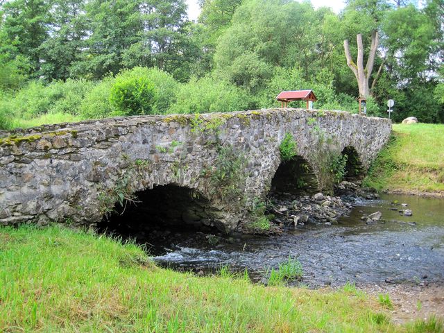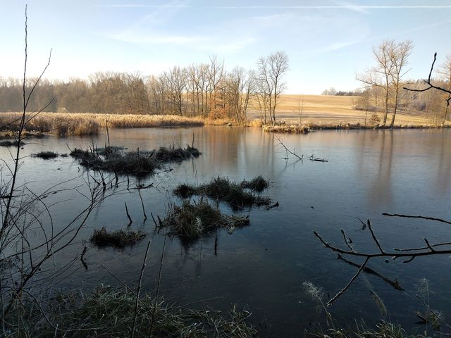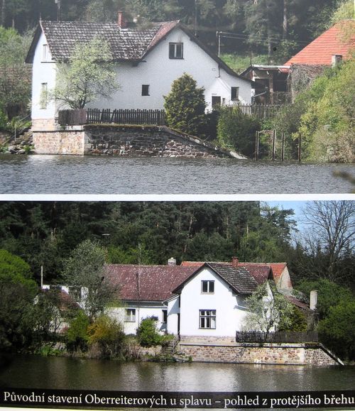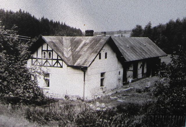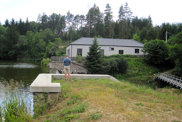 Upozornil nás, že na hrázi rybníka je infotabule s historií místa a fotografiemi, jak to tu původně vypadalo. Řekl, že dům, postavený do „L“ stojí na hranici katastru Polné a Věžnice – ačkoliv do Polné to jsou 4 km a do Věžnice mnohem blíž, obytné stavení patří od nepaměti do Polné, a děti musely chodit za každého počasí tou cestou, kterou jsme dneska šli, do školy. Hospodářské budovy patří však do katastru obce Věžnice.