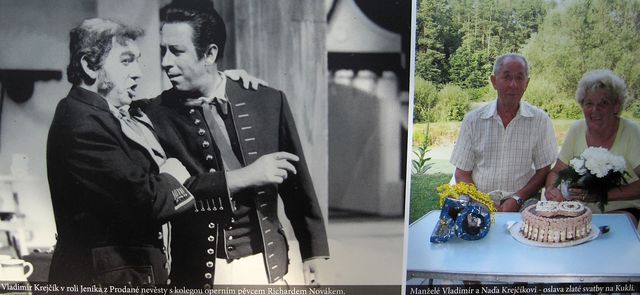 Pod fotografií vlevo je napsáno: Vladimír Krejčík v roli Jeníka z Prodané nevěsty s kolegou operním pěvcem Richardem Novákem; vpravo stojí: Manželé Vladimír a Naďa Krejčíkovi – oslava zlaté svatby na Kukli.
