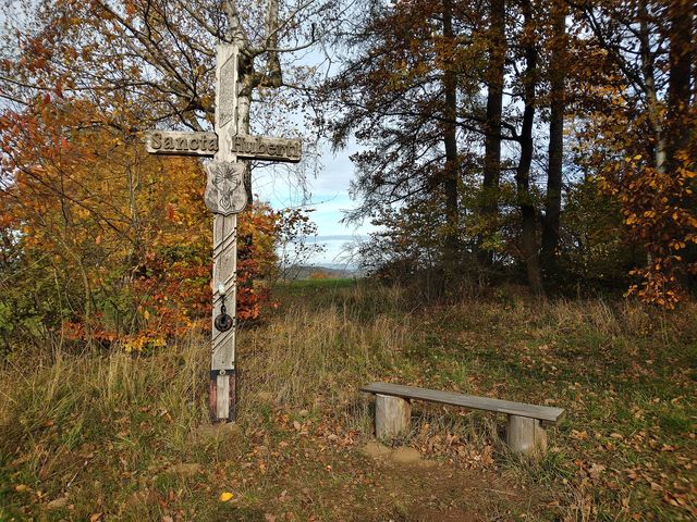 Dřevěný kříž sv. Huberta nedaleko bývalé kaple Andělů strážných na kopci nad městysem Úsobí.