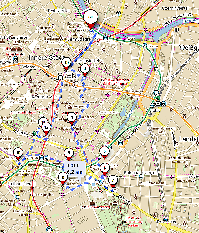 Autobus nás odvezl do centra Vídně, kde se účastníci na trase připravené paní Janou Součkovou postupně seznamovali s objekty spojenými s působením Gustava Mahlera. O jeho životě a díle nám paní Součková vyprávěla cestou v autobuse, na zastávkách městem zmiňovala základní fakta o budovách a institucích, jimiž je Vídeň proslulá a jsou uváděna v souvislosti s osobností Gustava Mahlera či jeho současníků nebo přátel.
