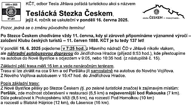 Pořadatelka Míla Bradová, předsedkyně KČT, odbor Tesla Jihlava, zorganizovala tento turistický výšlap a poslala nám následující propozice: