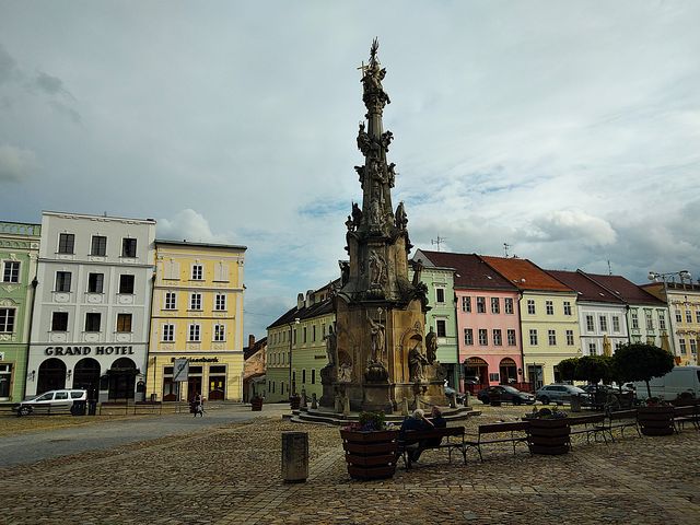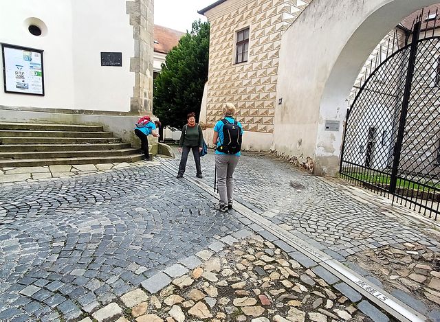 Vrátili jsme se na zeleně značenou stezku a pokračovali za dobrého počasí do Lásenice, odkud jsme autobusem dojeli do Jindřichova Hradce. Do odjezdu spoje na Jihlavu zůstal čas k prohlídce města – nemohli jsme nenavštívit 15. poledník a vynechat zpívající fontánu.