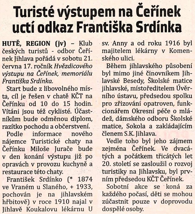 V úterý 17. června zveřejnil v Jihlavských listech redaktor Jiří Varhaník obsáhlý článek, v němž nový nájemce chaty Klubu českých turistů na Čeřínku Miloš Jurač hovoří o svých plánech pro oživení turistického ruchu v okolí, a především o opravách vnitřního vybavení, které za minulého nájemce několik let ostudně chátralo.