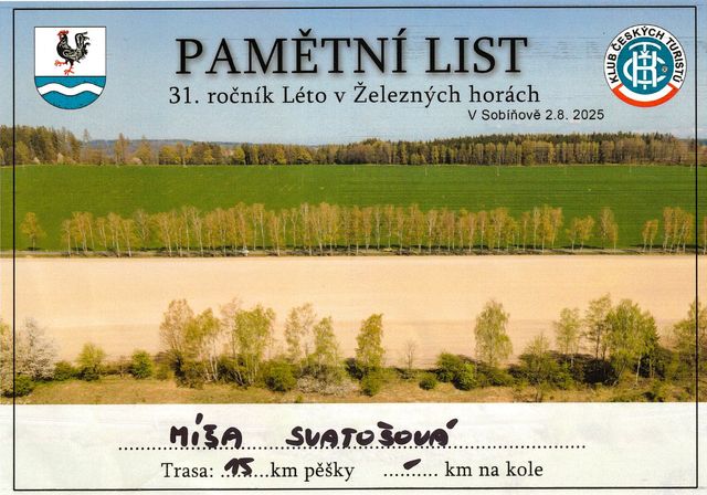 Akce jsem se zúčastnila na pozvání Milušky a Pavla, kteří mi nabídli místo ve svém autě. Po příjezdu do Sobíňova jsme se zaregistrovali – letos neúřadoval štáb pochodu v hostinci U Štefana, ale v místnosti hasičů otevřené do dvora, kde je i betonový parket, kolem nějž jsou prostorné stany pro účastníky pochodu a konzumenty dobrot, které tu pokaždé pořadatelé akce nabízejí. To vše se nachází v zadním traktu zdejšího Obecního úřadu, rámovaného množstvím kvetoucích růží.