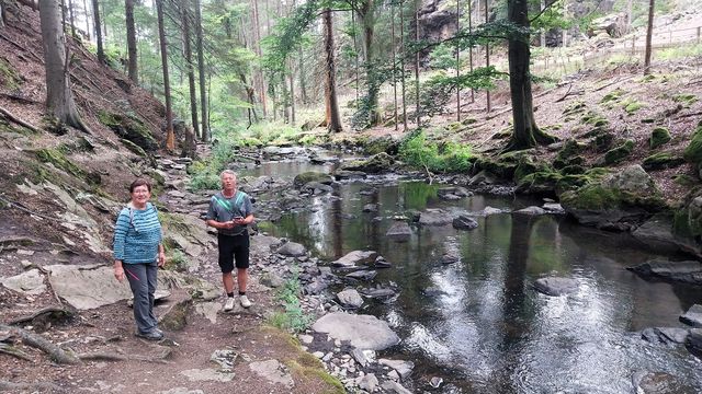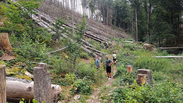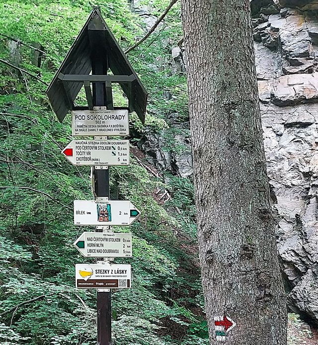 Autem jsme odjeli do Bílku a odtud šli po červeně značené turistické trase údolím Doubravky. Svahy nad řekou byly napadeny kůrovcem, proto byly před několika lety vykáceny a tabule informovaly návštěvníky, že dřevo zůstane na místě a nebude se uklízet, protože řada živočichů žije pouze na tlejícím dřevě.