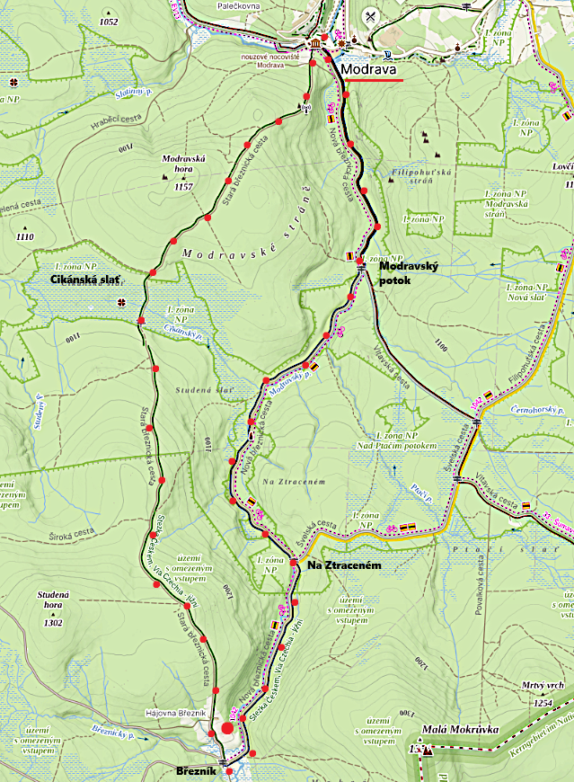 Z Modravy po ZTZ přes Cikánskou slať na Březník, odtud po MTZ kolem Modravského potoka do Modravy.