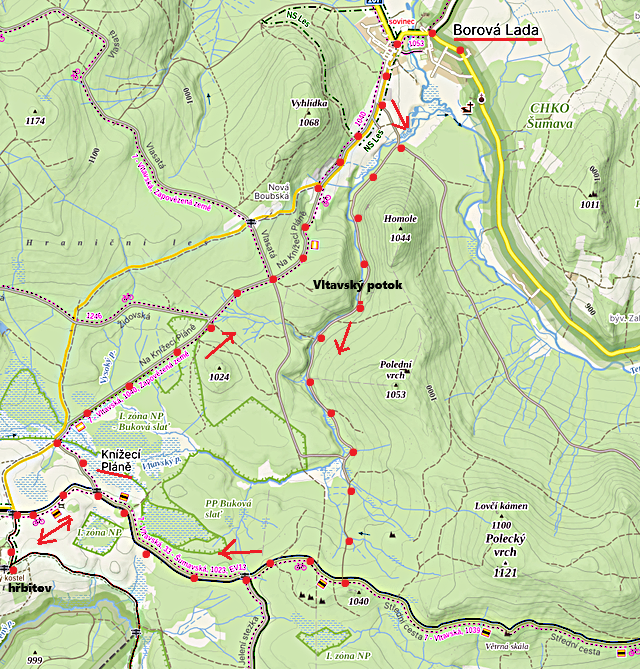 Z Borových Lad kolem pstruží farmy podél Vltavského potoka neznačenou cestou k modré turistické značce vedoucí z Polky na Knížecí Pláně (a na hřbitov), pak po cyklostezce zpět do Borových Lad.