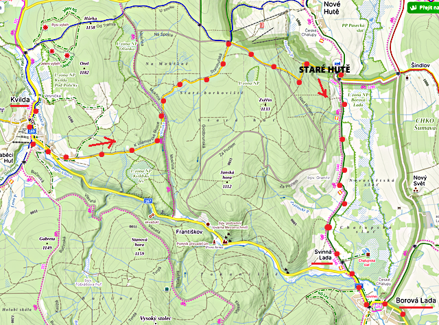 Z Kvildy značenými cestami přes Staré Hutě do Borových Lad.