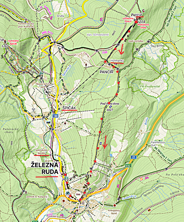 Z Pancíře po ČTZ na Hofmanky, odtud po MTZ do Železné Rudy.